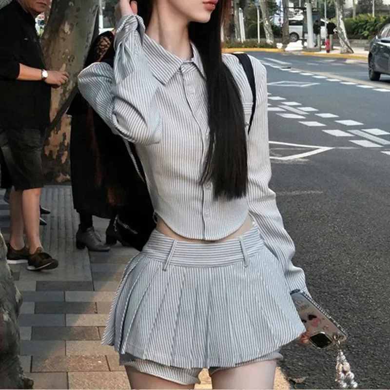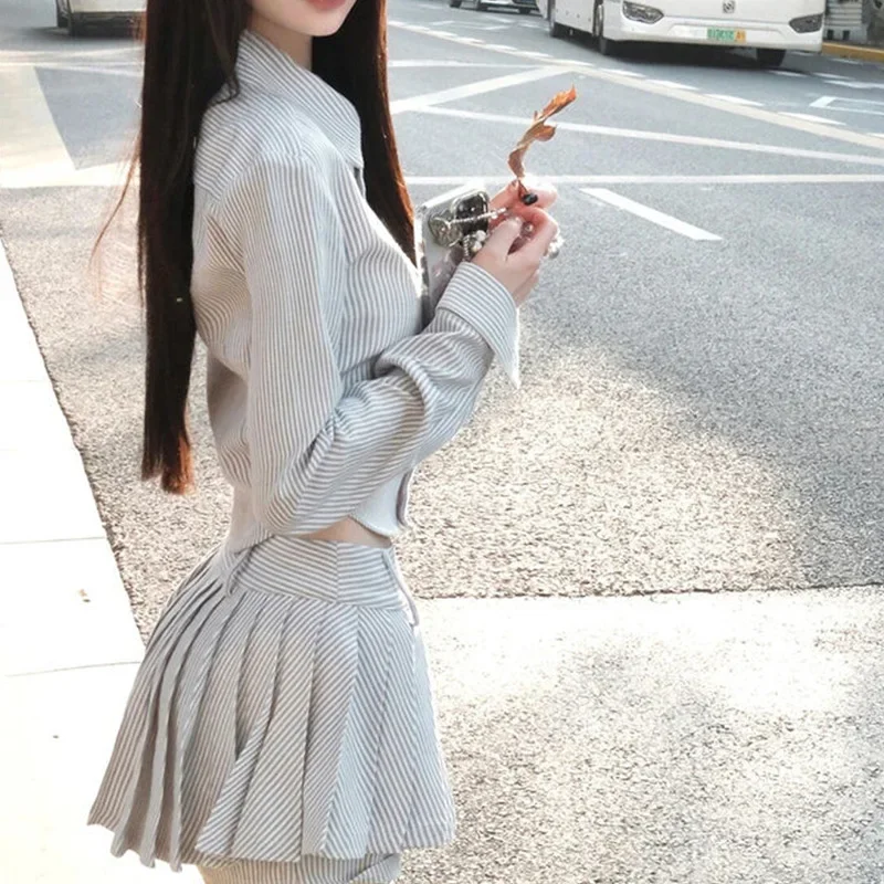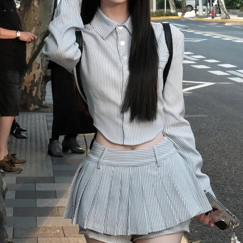 American Style Preppy Striped Long Sleeve Shirt High-waisted Skort Set For Women Spring Autumn 2024 Fashion