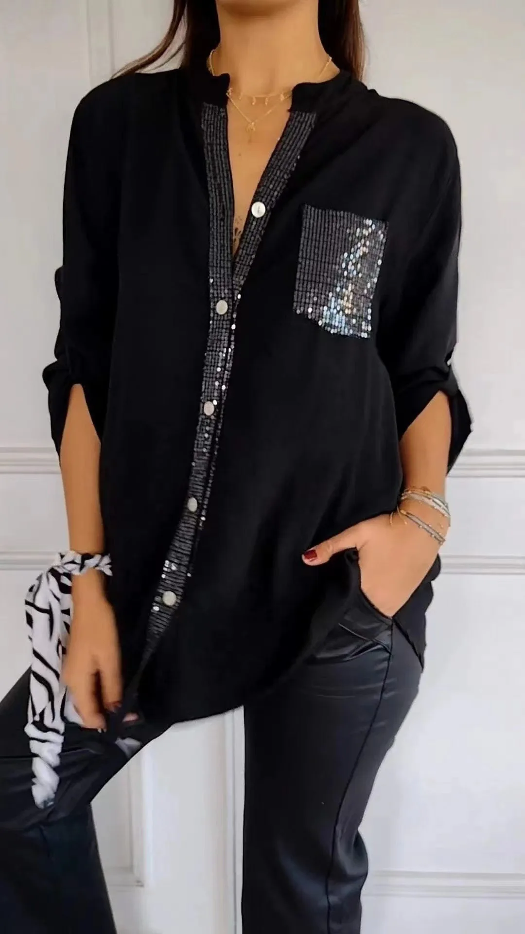 Casual Shirt Women Blouses V-neck Sequin Splicing Long-sleeve New Autumn Casual Loose Collar Button Pocket Office Ladies Clothes
